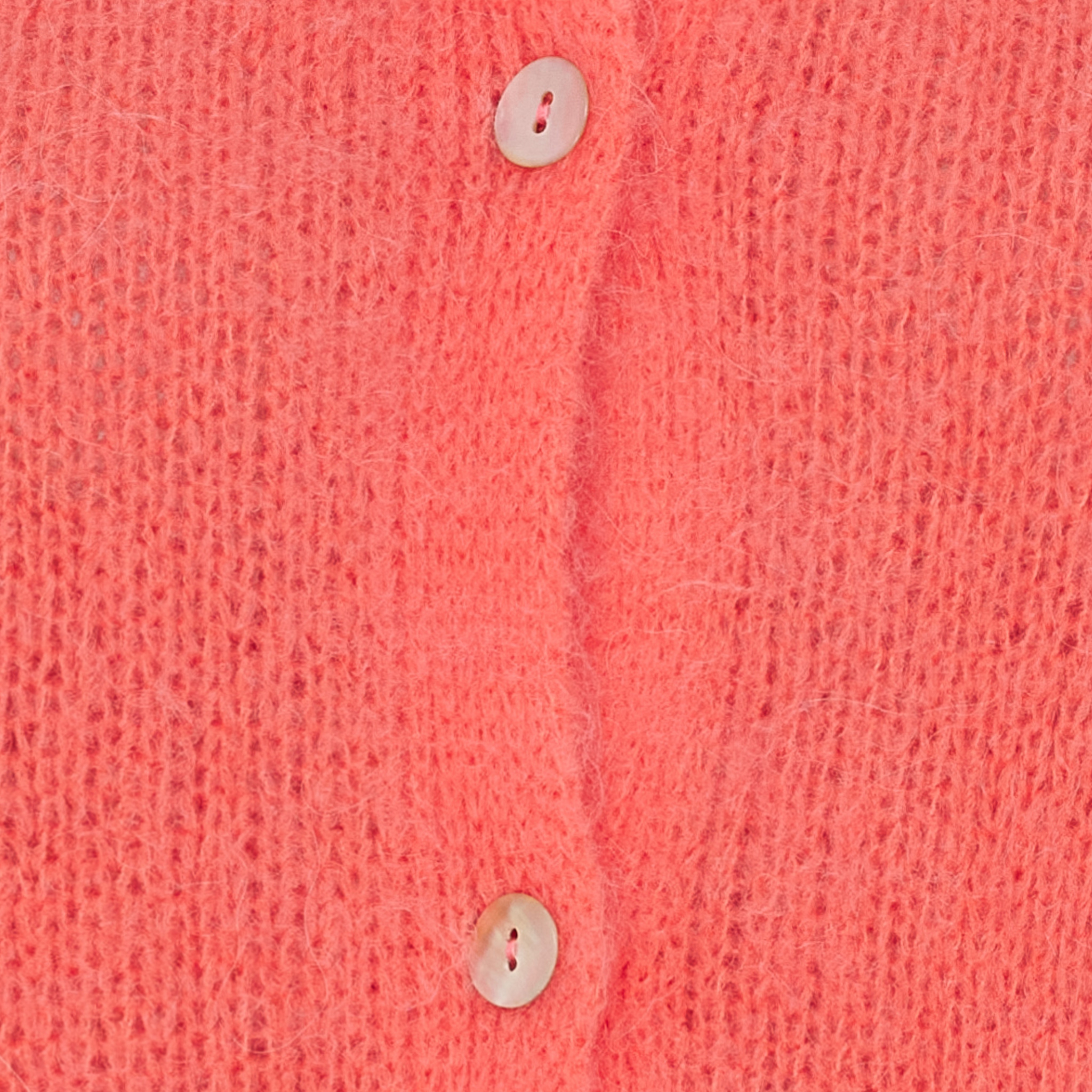 Super soft, alpaca mix cardigan with three-quarter length puffed sleeves in a warm coral.