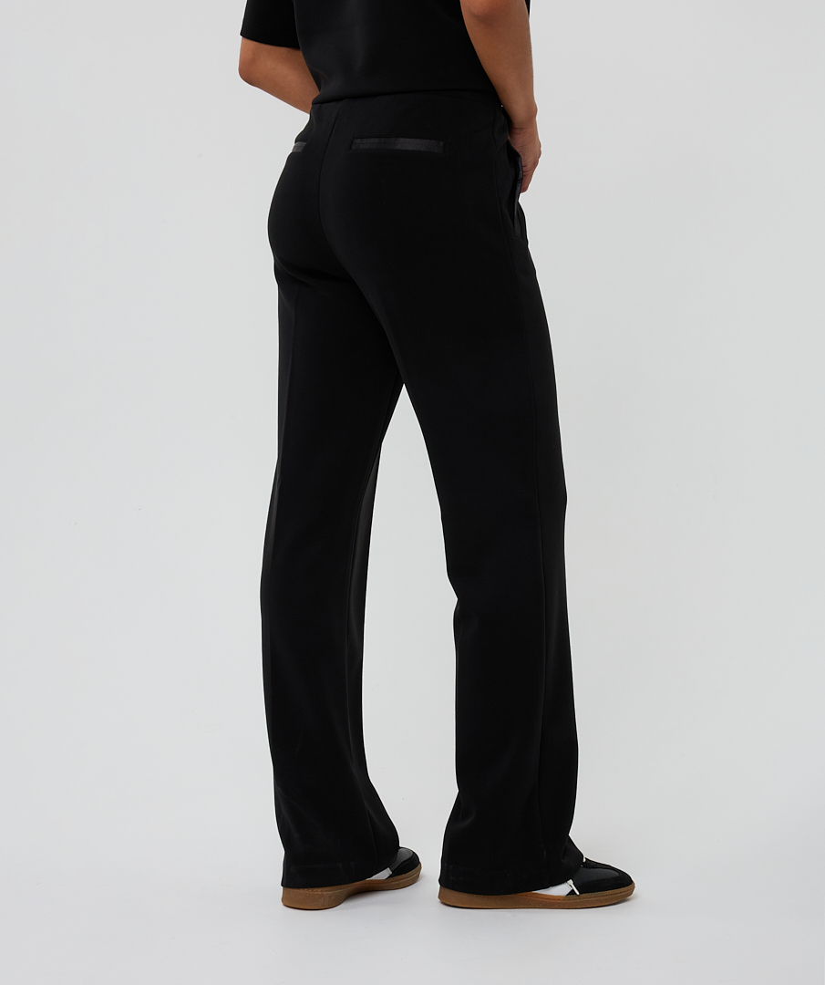 Rock the sports luxe vibe in these super soft, black, wide leg elasticated waist trousers with silky black feature pocket detail.