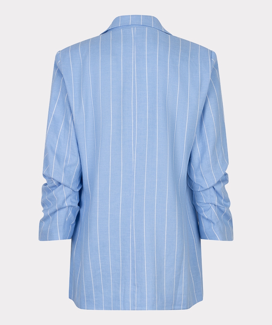 Super stylish linen blend, pacific blue striped blazer – with ruched sleeves for a cool and casual vibe. Fully lined and featuring an open (buttonless) front.