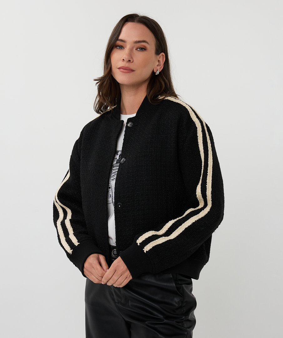 Rock the sports luxe vibe in this striking chanel-style textured black bomber with double side stripe, front feature pockets and concealed popper front fastening.
