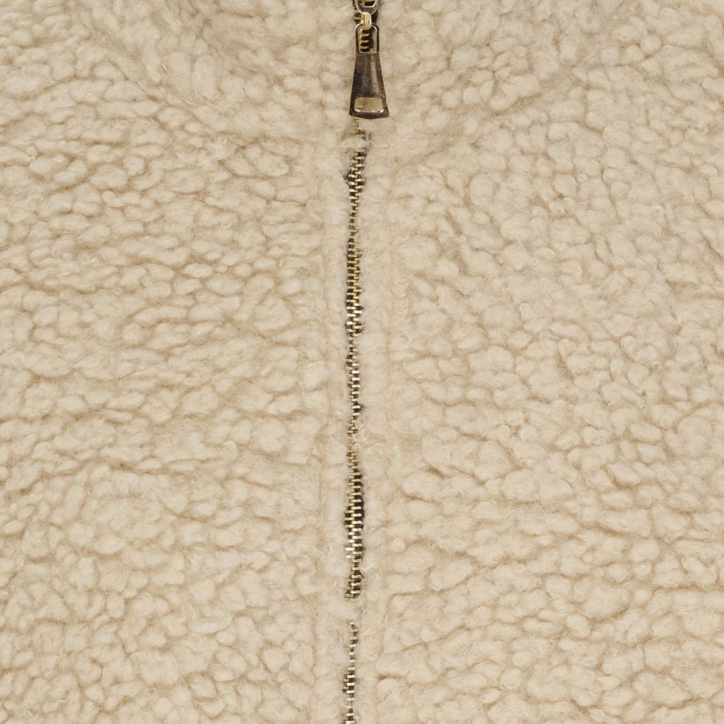 Cute fluffy faux sheepskin jacket with funnel neck, front gold zip and pockets.