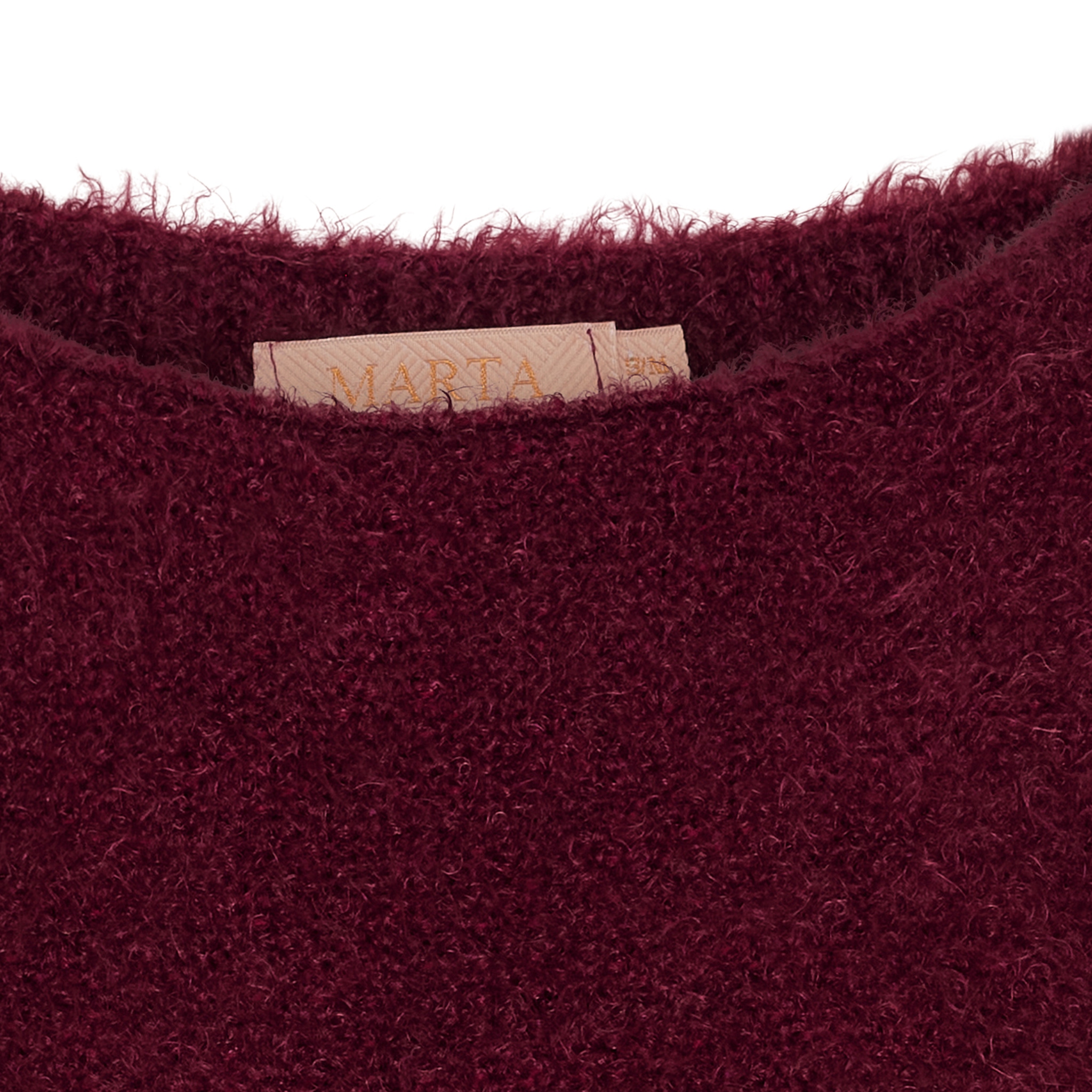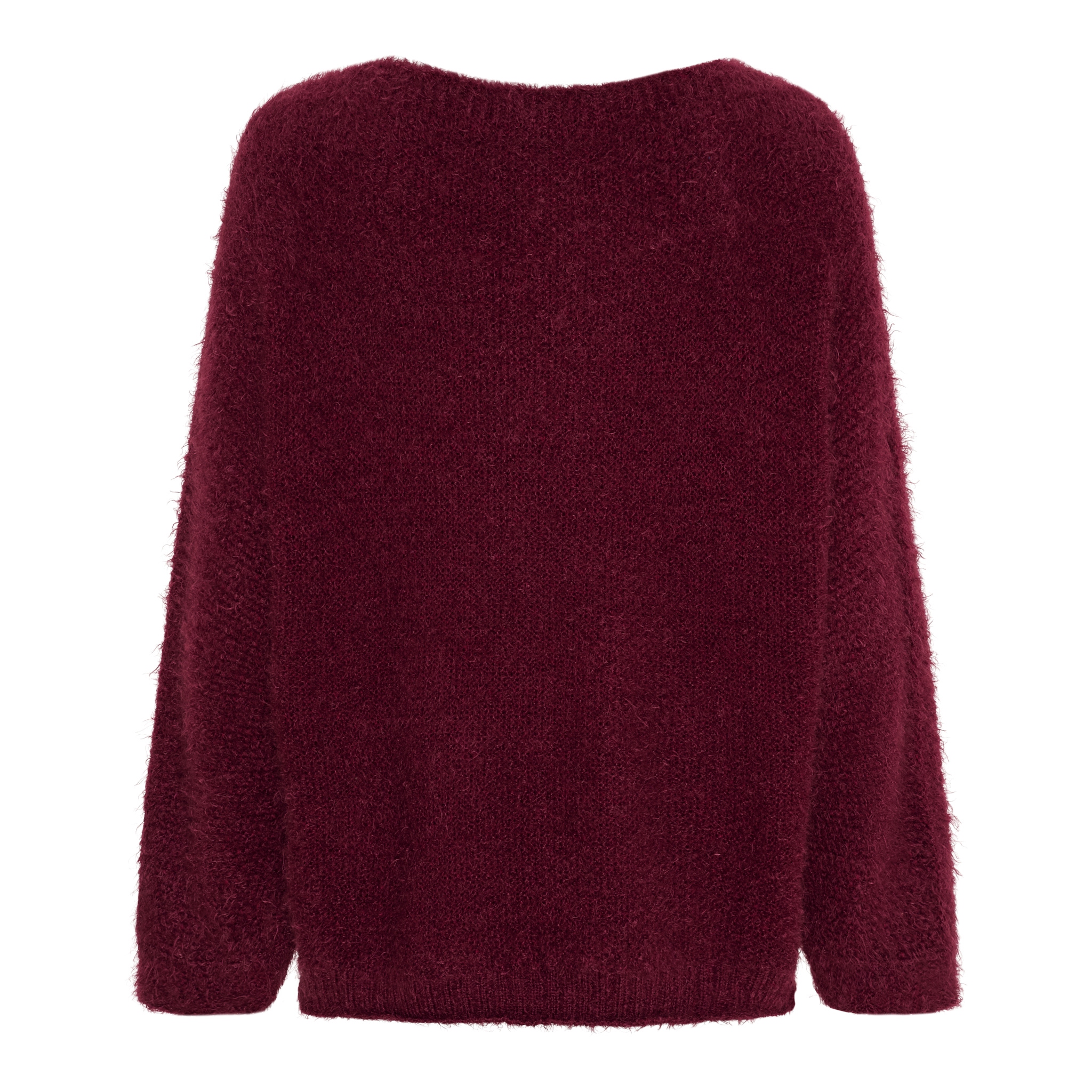 Super soft, fluffy knit in a rich wine red with batwing sleeves and flattering boat neck.