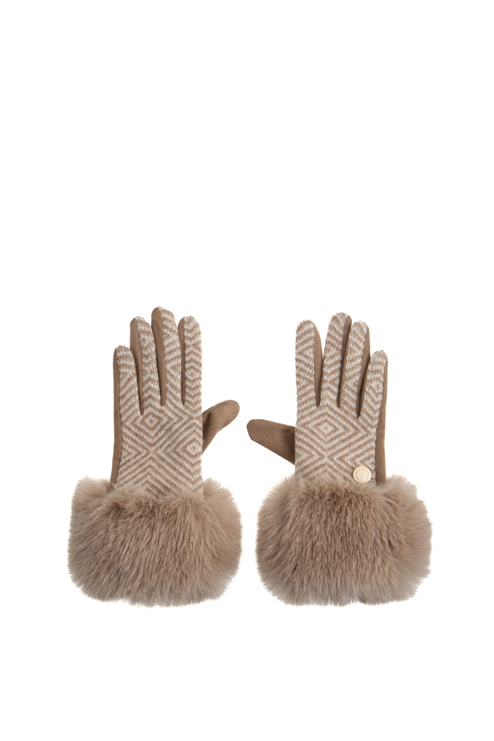 Keep warm in style with these elegant camel, faux fur trim gloves with a striking geometric print feature and suede effect palm.