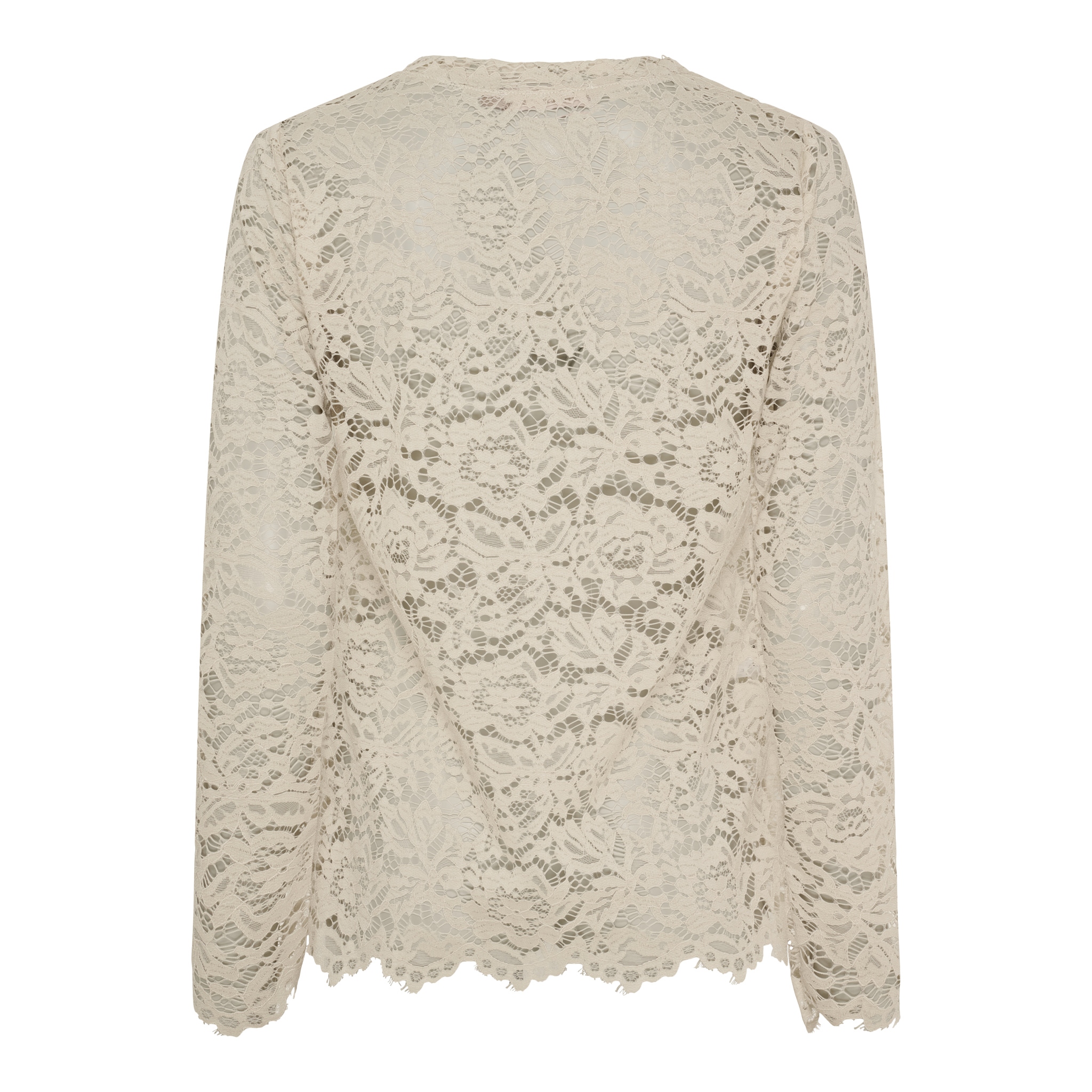 Lacey long sleeved top with round neck and pretty scalloped edge to the hem and sleeves.