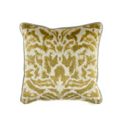 Peacock Green printed velvet accent cushion, beautifully made in the UK by Voyage Maison. Front is printed velvet, with a neutral plain linen back.