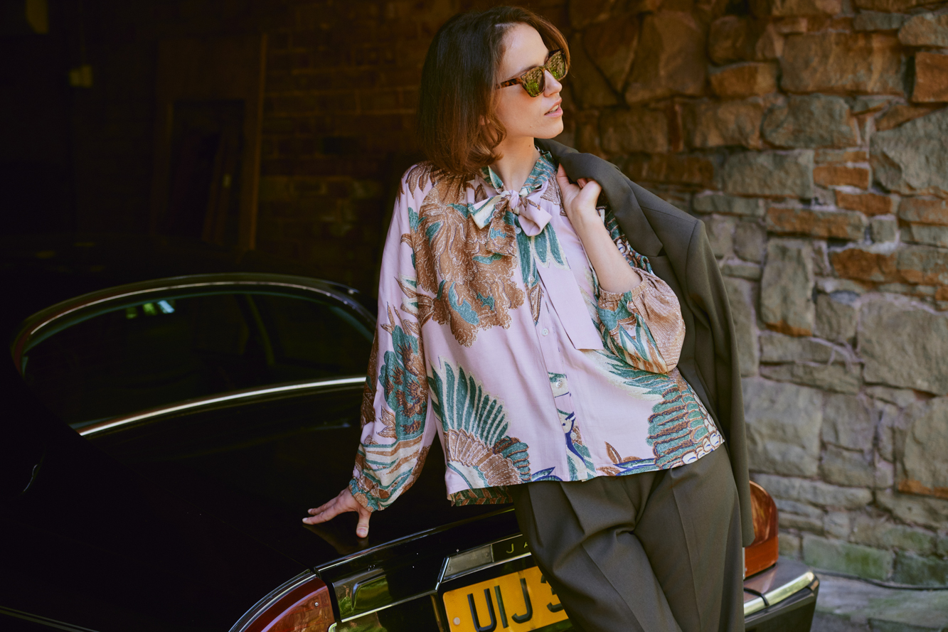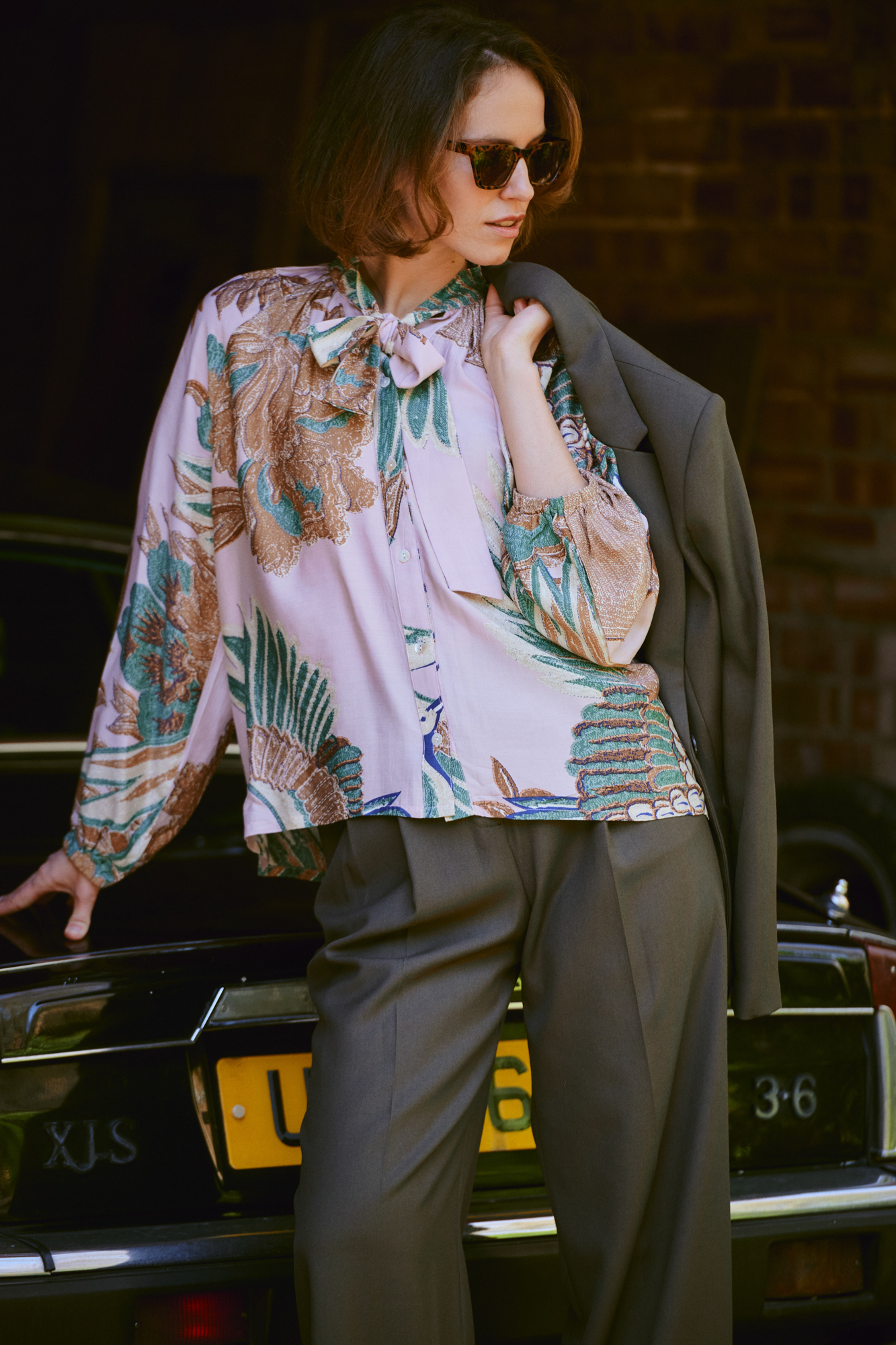 Elegant new season Pussy Bow Blouse by One Hundred Stars in the gorgeous Crane Plaster Pink design. With the cranes featuring a combo of camel, jade and stone colours, this blouse exudes a soft classy vibe and drapes beautifully.