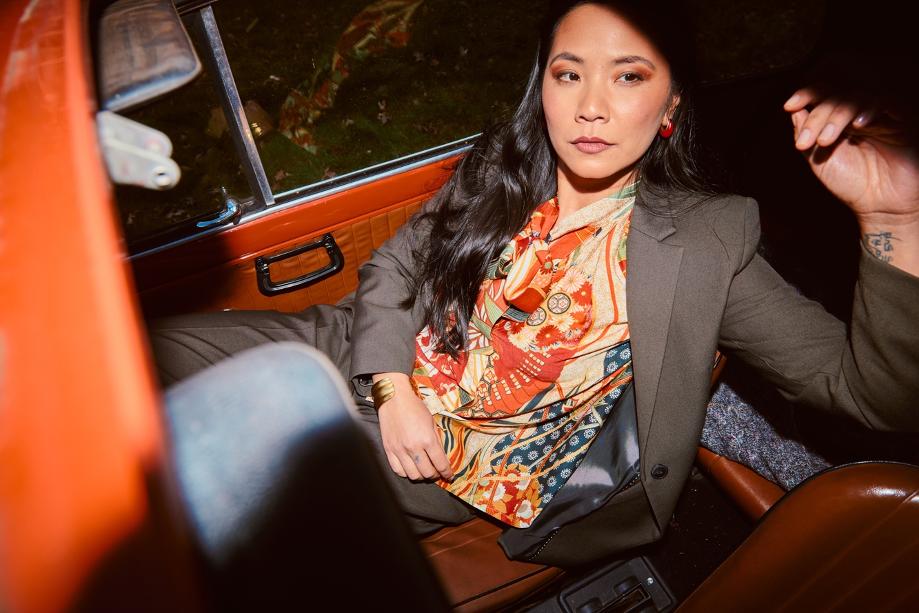We love the pearl buttons and the versatility of the tie neck.