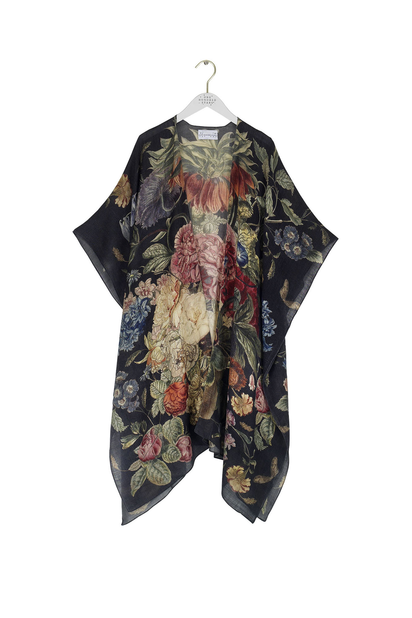 Gorgeous winter weight wool throwover by One Hundred Stars in a bold floral print with smart black background.