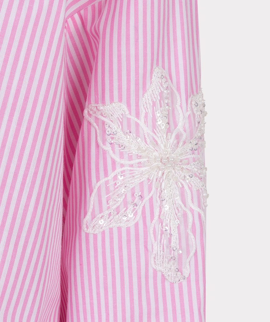 Super pretty pink and white fine-striped shirt. With its white applique flower feature, this shirt is far from the ordinary.