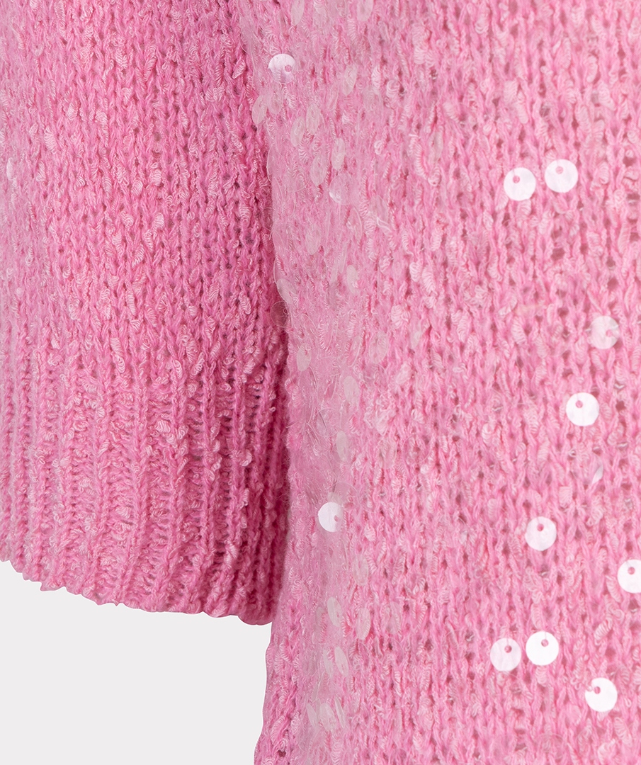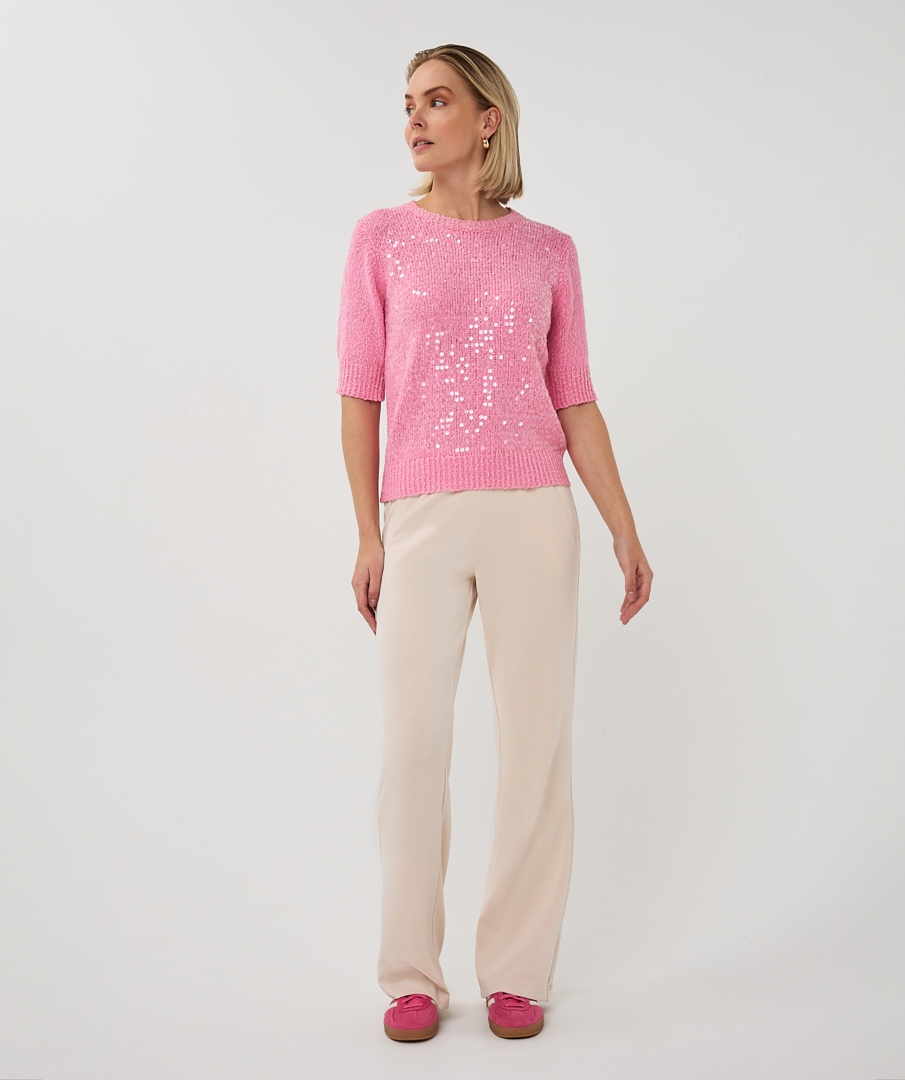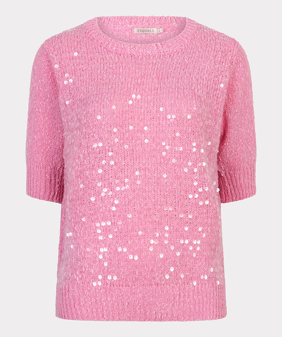 Fitted short sleeve pink knit with sequins to the front. Wear as a standalone piece or layer up.