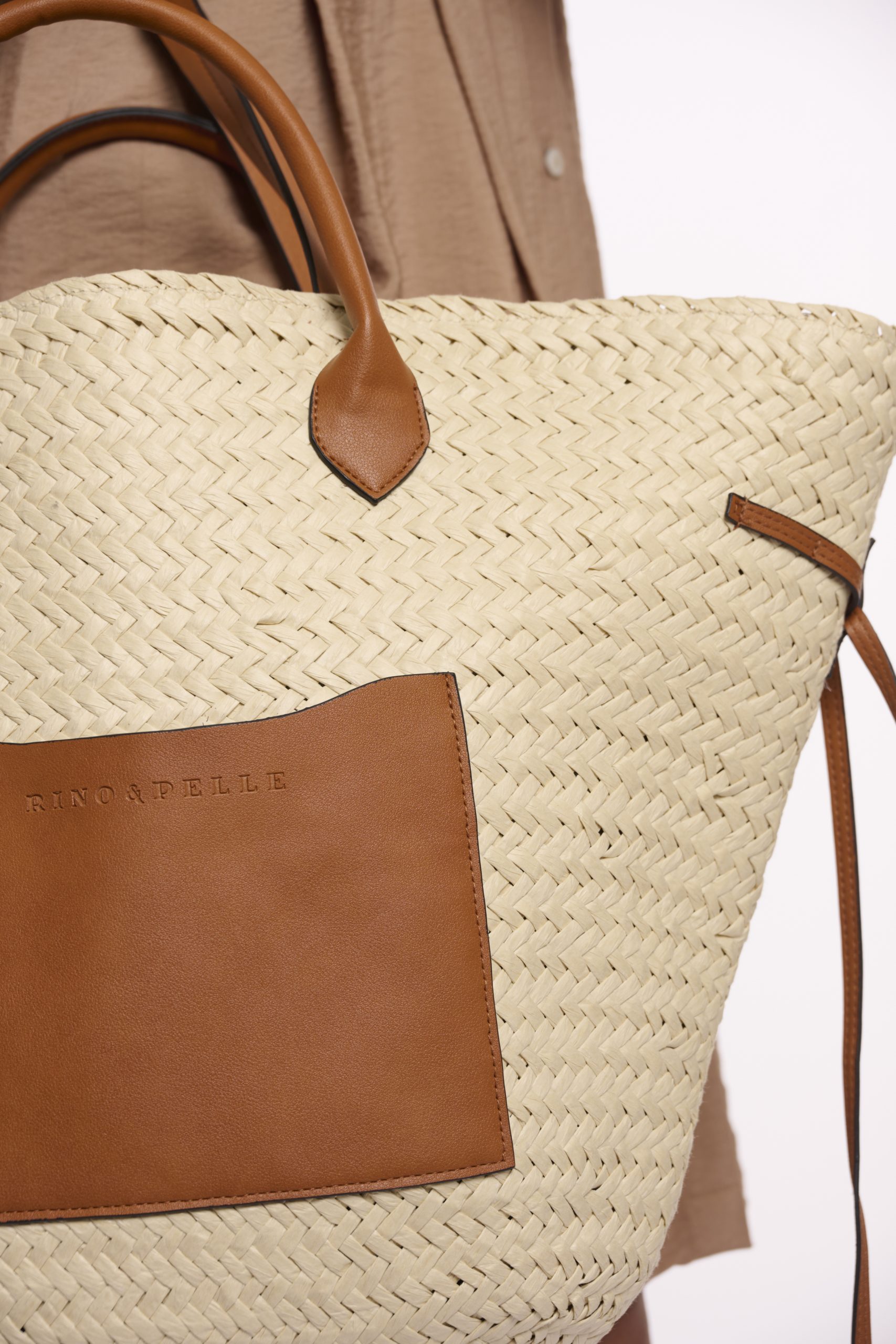 Generous sized, woven summer bag by Rino & Pelle, with tan faux leather handles and trims and fully lined interior.